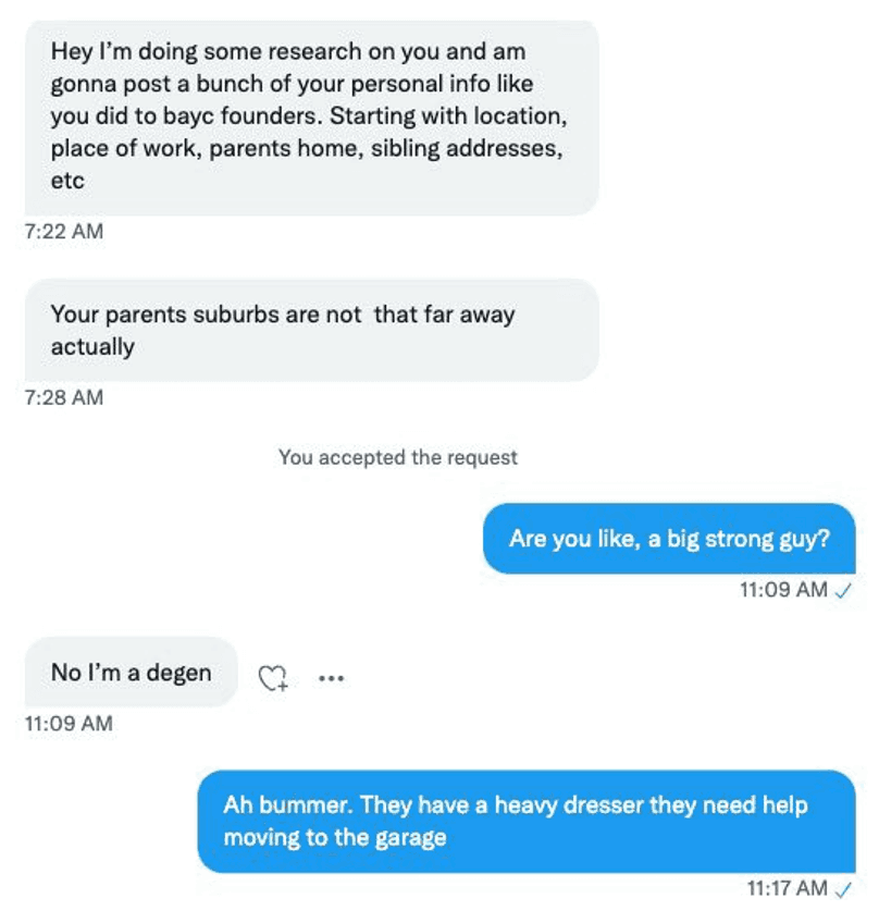 En febrero de 2022, en un extenso artículo sobre “responsabilidad en la era cripto”, BuzzFeed News expuso deliberadamente las identidades de los dos creadores de Bored Ape Yacht Club. El sitio web de noticias “buscó en los registros de negocios públicos para revelar las identidades de los dos fundadores principales”, cuyos nombres, edades, profesiones, ubicación y también la información antigua disponible en la web, ahora están disponibles para cualquiera.